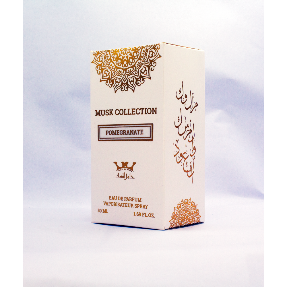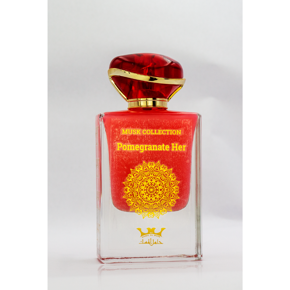 captivating fragrance that blends the juicy sweetness of pomegranate with the soft warmth of musk. It opens with a vibrant burst of pomegranate and fruity notes, creating an enticing and refreshing introduction. The heart reveals delicate floral accents that enhance the fruitiness, adding a touch of elegance. The base of creamy musk provides depth and warmth, making this scent perfect for daily wear and evoking a sense of femininity and allure.